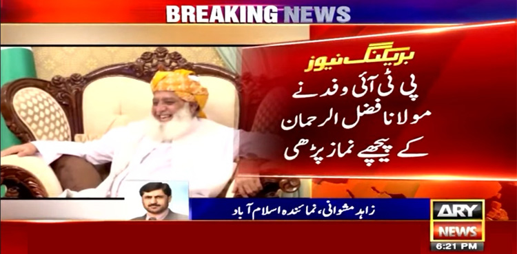 ذرائع کے مطابق اس دوران نماز کا وقت ہونے پر پی ٹی آئی کے وفد میں شامل ارکان نے فضل الرحمان کے پیچھے نماز ادا کی۔