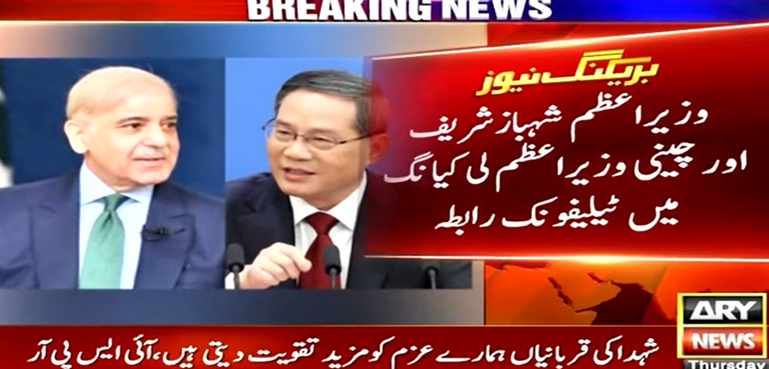 وزیراعظم شہباز شریف اور چینی وزیراعظم لی کیانگ میں ٹیلیفونک رابطہ ہوا دونوں رہنماؤں کے درمیان گفتگو روایتی گرمجوشی اور ہم آہنگی پر مبنی تھی۔
