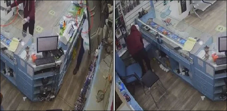 ڈکیتی کی ویڈیو سوشل میڈیا پر وائرل ہوگئی، جس میں دیکھا جاسکتا ہے کہ دو نوجوان موبائل شاپ میں داخل ہوتے ہیں اور اسلحے کے زور پر نقدی اور موبائل فون لے اڑتے ہیں۔