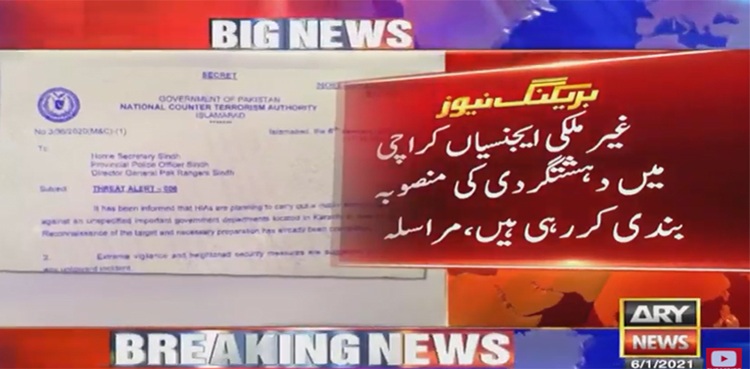 مراسلہ کے مطابق غیر ملکی ایجنسیاں کراچی میں دہشتگردی کی منصوبہ بندی کر رہی ہیں اور شہر کے اہم سرکاری دفتر یا عمارت کو نشانہ بنایا جا سکتا ہے۔