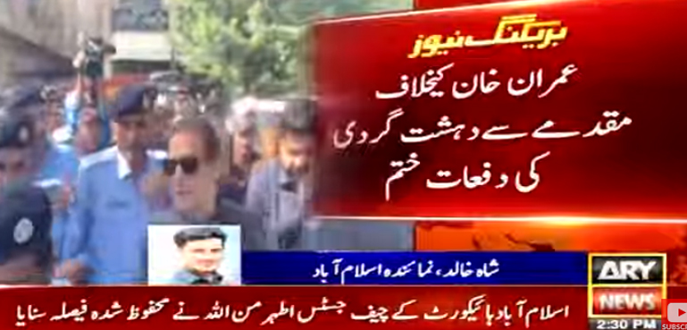اسلام آباد ہائیکورٹ نے عمران خان کی درخواست پر فیصلہ سنا دیا ہے اور پی ٹی آئی چیئرمین کے خلاف مقدمے سے دہشتگردی کی دفعات ختم کردی ہیں۔