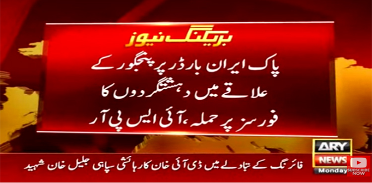 آئی ایس پی آر کے مطابق پاک ایران بارڈر پر پنجگور کےعلاقے میں دہشتگردوں نے فورسز پر حملہ کیا دہشتگردوں ‏نےسیکیورٹی فورسزکی پٹرولنگ ٹیم کونشانہ بنایا گیا۔