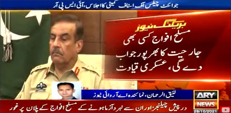 عسکری قیادت نے اس عزم کا اعادہ کیا ہے کہ مسلح افواج کسی بھی جارحیت کا بھرپور جواب دےگی۔