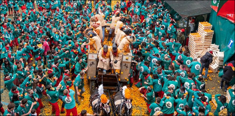 روم : اطالوی میں شہریوں کا ایک دوسرے پر مالٹوں سے حملہ، حملہ کرنے والے 8ہزار سے زائد افراد میں نہ صرف اطالوی بلکہ غیر ملکی شہری بھی شامل تھے۔