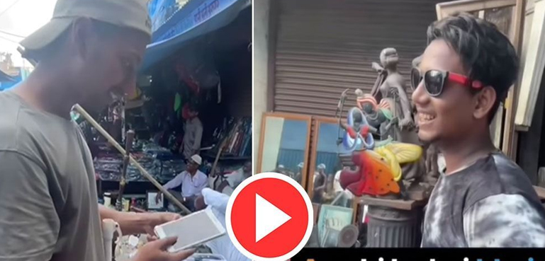 اس ویڈیو میں دیکھا جا سکتا ہے کہ نوجوان ایک دکان پر جاکر موبائل فون اٹھاتا ہے اور دکاندار سے اس کی قیمت پوچھتا ہے، جس پر سیاہ چشمہ لگائے دکاندار اسے 20 ہزار روپے قیمت بتاتا ہے۔ قیمت سننے کے بعد نوجوان کہتا ہے کہ یہ بالکل میرے فون جیسا لگ رہا ہے۔