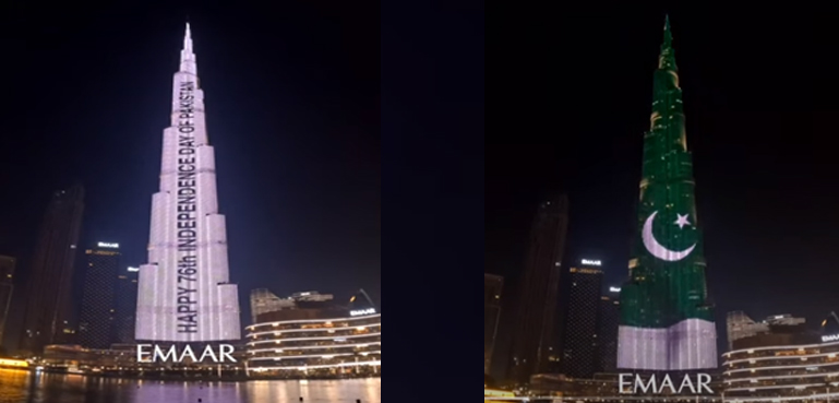 اے آر وائی نیوز کے مطابق پاکستان کا 76 واں جشن آزادی ملک کے طول وعرض سمیت بیرون ممالک بھی جوش وخروش سے منایا گیا۔ دنیا کی سب سے بلند عمارت دبئی میں واقع برج الخلیفہ بھی سبز ہلالی پرچم کے رنگ میں رنگ گیا جس کی ویڈیو سوشل میڈیا پر جاری کی گئی اور جاری پیغام میں پاکستانیوں کو 76 ویں جشن آزادی کی مبارک باد دی گئی۔