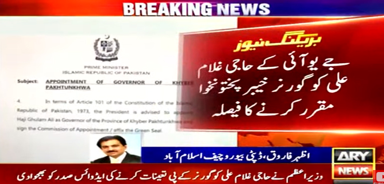 جے یو آئی کے غلام علی کو گورنر خیبرپختونخوا مقرر کرنے کا فیصلہ کیا ہے اور وزیراعظم نے اس حوالے سے صدر مملکت کو سفارش بھجوا دی ہے۔