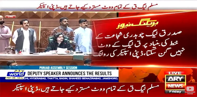 ڈپٹی اسپیکر نے ق لیگ کے 10 ووٹوں کو مسترد کرتے ہوئے کہا کہ سپریم کورٹ کے احکامات کی روشنی میں پارٹی سربراہ کی ہدایت کے خلاف ووٹ دینے پر ق لیگ کے ووٹ مسترد کیے جاتے ہیں۔