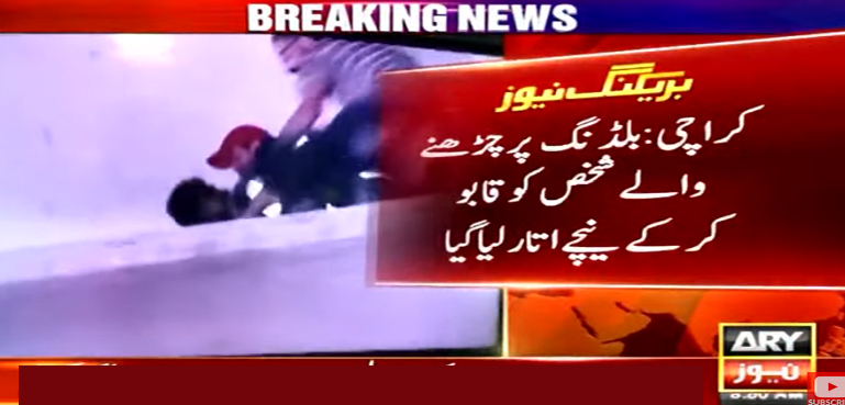 کراچی میں نشے کا عادی شخص بلڈنگ پر چڑھ گیا جس کو پولیس اور ریسکیو اداروں نے قابو کرکے بحفاظت نیچے اتار لیا۔