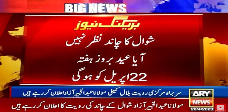 چیئرمین رویت ہلال کمیٹی مولانا عبدالخبیر آزاد نے اسلام آباد میں پریس کانفرنس کرتے ہوئے اعلان کیا کہ ملک کے کسی حصے سے شوال کا چاند نظر نہیں آیا لہذا عیدالفطر 22 اپریل بروز ہفتے کو ہوگی۔