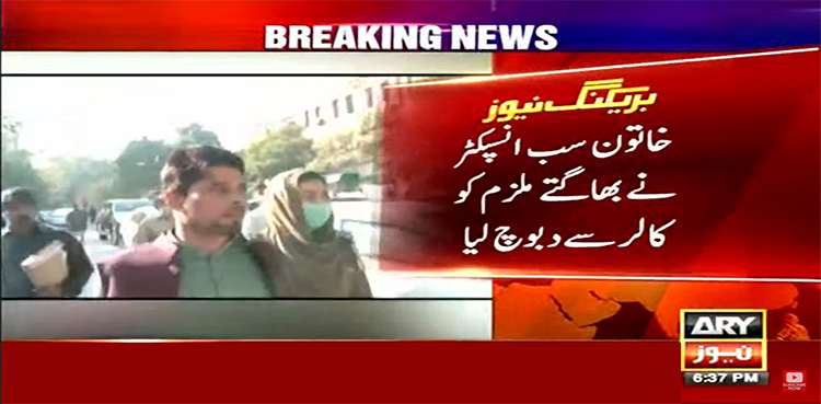 خاتوں سب انسپکٹر نے ملزم کو کالر سے پکڑ لیا اور اس کی فرار ہونے کوشش دھری کی دھری رہ گئیں. ملزم کی بھرپور کوشش کے باوجود خاتون اہلکار نے اسے بھاگنے نہ دیا ۔