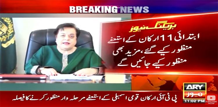اسپیکر قومی اسمبلی نے ممبران قومی اسمبلی علی محمد خان (NA-22)، فصل محمد خان (NA-24)، شوکت علی (NA-31)، فخر زمان خان (NA-45)، فرخ حبیب (NA-108)، اعجاز احمد شاہ (NA-118)، جمیل احمد خان (NA-237)، محمد اکرم چیمہ (NA-239)، عبدل شکور شاد (NA-246)، ڈاکٹر مہر انساء شیریں مزاری (مختص نشست), شندانہ گلزار خان (مختص نشست) کے استعفے قبول کیے۔
