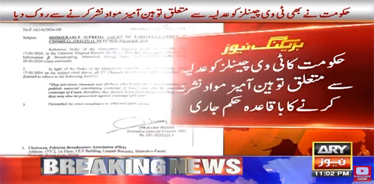 حکومت نے بھی ٹی وی چینلز کو عدلیہ سے متعلق توہین آمیز مواد نشر کرنے سے روک دیا۔