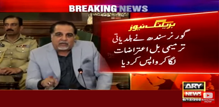 نمائندہ اے آر وائی نیوز نے اپنے ذرائع کے حوالے سے کہا ہے کہ گورنر سندھ نے اپوزیشن جماعتوں سے مشاورت اور تحفظات سننے کے بعد بل پر اعتراضات اٹھائے۔