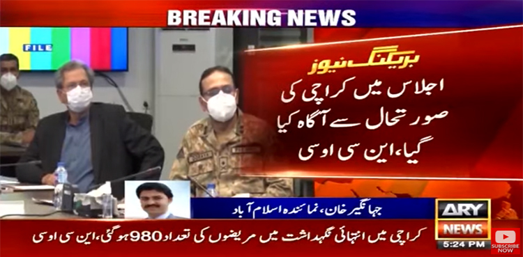 تفصیلات کے مطابق وفاقی وزیر اسد عمر کی قیادت میں این سی او سی کا اجلاس ہوا جس میں کراچی کی صورتحال سے آگاہ کیا گیا اور بریفنگ میں بتایا گیا کہ کراچی میں کوروناوباکی شرح 26.32فیصد تک پہنچ چکی ہے سندھ حکومت وباکی صورتحال پر گہری نظر رکھے ہوئے ہے۔