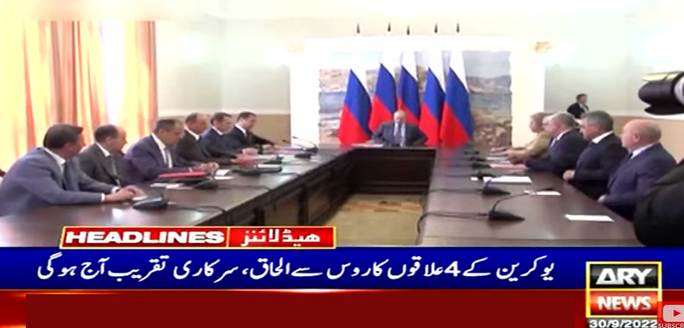 روسی صدارتی محل کے ترجمان کریملین کے مطابق ریفرنڈم کے نتیجے میں یوکرین کے چار ریجنز خیرسون، زاپوریزیا، ڈونیسک اور لوہانسک کی روس سے الحاق کی سرکاری تقریب آج ہوگی، روسی صدر ولادیمیر پیوٹن ان علاقوں کی روس میں شمولیت کی دستاویز پر دستخط کریں گے۔