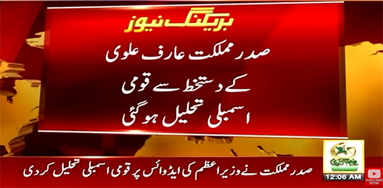 صدر مملکت عارف علوی نے وزیراعظم شہبازشریف کی جانب سے بھیجی گئی سمری پر دستخط کر دیے جس کے بعد قومی اسمبلی تحلیل ہو گئی۔