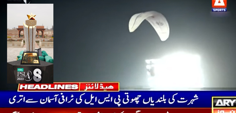 ایچ بی ایل پاکستان سپر لیگ نے جس طرح مقبولیت کی بلندیوں کو چھوا اسی طرح 8ویں ایونٹ کی ٹرافی آسمان کی بلندیوں سے اسٹیڈیم میں اتری۔