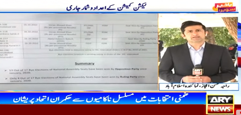 اے آر وائی نیوز کے مطابق الیکشن کمیشن آف پاکستان کی جانب سے تحریک عدم اعتماد کی کامیابی اور موجودہ حکومت کے قیام کے بعد سے ملک میں ہونے والے ضمنی الیکشن کے حوالے سے مفصل رپورٹ جاری کی گئی ہے جس کے اعداد وشمار ظاہر کرتے ہیں کہ 12 جماعتوں پر مشتمل اتحاد اپنی مقبولیت کھونے لگا ہے جب کہ پی ٹی آئی کی مقبولیت اس کی حکومت کے خاتمے کے بعد مسلسل بڑھی ہے۔