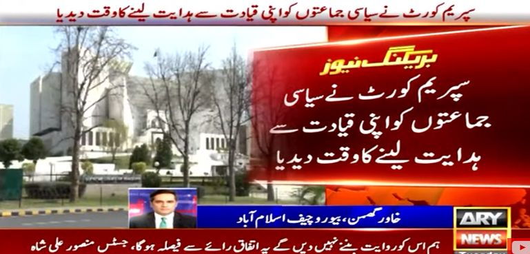 سپریم کورٹ نے پنجاب اور کے پی میں انتخابات کی تاریخ سے متعلق ازخود نوٹس کی سماعت میں سیاسی جماعتوں کو اپنی قیادت سے ہدایت لینے کا وقت دیتے ہوئے سماعت شام 4 بجے تک کا وقفہ دے دیا ہے۔