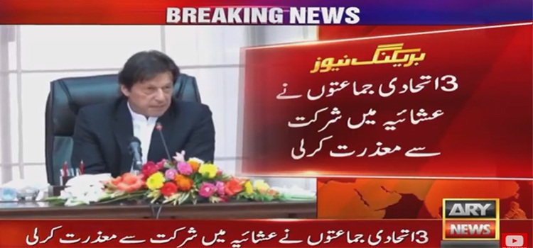 اسلام آباد: وزیراعظم عمران خان کی اتحادی جماعتوں کے تحفظات اور گلے شکوے دور کرنے کے مصالحتی عمل کو دھچکا لگ گیا، 3اتحادی جماعتوں نے وزیراعظم کی جانب سے دیے جانے والے عشائیہ میں شرکت سے معذرت کر لی۔