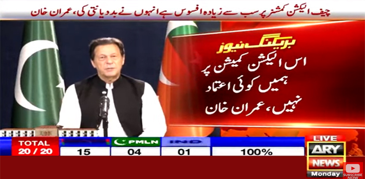 عوام سے خطاب میں عمران خان نے کہا کہ چیف الیکشن کمشنر نے ہمیں ہروانے کا ہر حربہ استعمال کیا جس طرح الیکشن کرائےگئےوہ بہت افسوس ناک ہے ہمارے خلاف ہر ہتھکنڈا استعمال کیاگیا چیف الیکشن کمشنرپرسب سےزیادہ افسوس ہےانہوں نےبددیانتی کی ہے الیکشن کمشنر کو پتہ ہی نہیں 40 لاکھ لوگوں کو مردہ قرار دےدیا کسی اورملک میں ایسی غلطی ہوتی توچیف الیکشن کمشنر مستعفی ہو چکا ہوتا۔