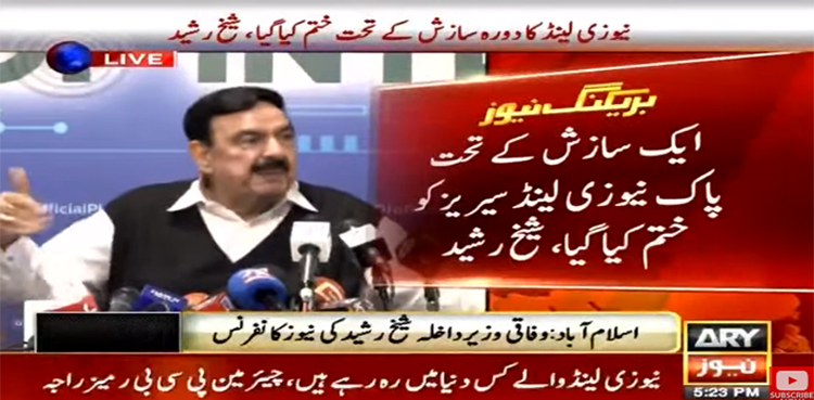 اسلام آباد میں اہم پریس کانفرنس کرتے ہوئے وزیرداخلہ شیخ رشید نے بتایا کہ ہماری طرف سے فول پروف سیکورٹی تھی خود نیوزی لینڈ کی سیکورٹی ٹیم نے بھی ہمارے اقدامات کو سراہا اور اطمینان کا اظہار کیا لیکن دستانے پہنے ہاتھوں نے سازش کی یہ وہی ہاتھ ہیں جو افغانستان میں پاکستان کو قربانی کا بکرا بنانا چاہتے تھے۔