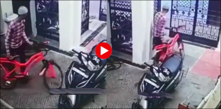 ویڈیو میں دیکھا جاسکتا ہے کہ ایک چور پیدل آیا اور جب اس نے دیکھا کہ گھر کے صحن میں کوئی موجود نہیں ہے اور سائیکل اور موٹر سائیکل کھڑی ہیں تو اس نے سائیکل چرانے کا ارادہ کیا۔