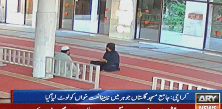 کراچی : گلستان جوہر کی مسجد میں نابینا نعت خواں لوٹ لیا گیا، ایک چور نعت ریکارڈ کر کے وائرل کرنے کے بہانے نابینا موذن سے رقم اور موبائل فون لےاڑا۔