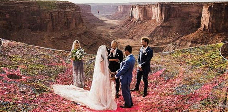 شادی شدہ جوڑے کے اس مقام کا انتخاب کرنے کے ساتھ ساتھ ایک اور اسٹنٹ کیا وہ یہ کہ جہاں انہوں نے شادی کی وہ ایک نیٹ تھا، جسے نہایت مہارت کے ساتھ پہاڑیوں کی چوٹیوں کے ساتھ باندھا گیا تھا۔