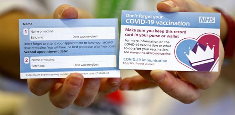 برطانوی حکومت نے واضح کیا ہے کہ ‘ویکسین پاسپورٹ’ جاری کرنے کا کوئی منصوبہ نہیں بنایا گیا اس لیے ویکسین لگانےوالوں کو’کووڈ پاسپورٹ‘نہیں دیا جائے گا بلکہ ویکسین لگوانے والوں کو ویکسینیشن کارڈ دیا جائےگا۔