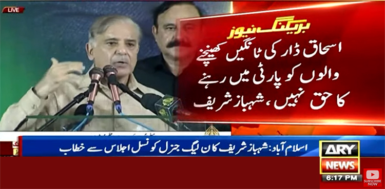 اسلام آباد ن لیگ کے مرکزی جنرل کونسل اجلاس سے کلیدی خطاب کرتے ہوئے شہبازشریف نے کہا کہ کچھ لوگ اسحاق ڈارکی ٹانگیں کھینچ رہےہیں اسحاق ڈارکیخلاف جوباتیں کررہےہیں انہیں پارٹی میں رہنےکا کوئی حق نہیں۔