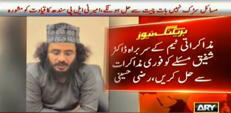 امیر ٹی ایل پی سندھ رضی حسینی نے اپنے ویڈیو پیغام میں کہا کہ ہم کسی اورکیلئےنہیں حضورﷺکی حرمت کے لئےنکلے ہیں، مسائل سڑکوں پر نہیں بات چیت سے حل ہوں گے، مذاکراتی ٹیم کے سربراہ ڈاکٹرشفیق مسئلے کو فوری مذاکرات سےحل کریں۔