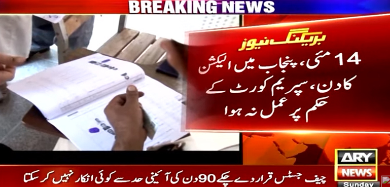 اے آر وائی نیوز کے مطابق سپریم کورٹ نے پنجاب میں 14 مئی کو صوبائی اسمبلی کے انتخابات کا حکم دیا تھا تاہم الیکشن کمیشن اس پر عملدرآمد نہ کر سکا اور واضح احکامات کے باوجود آج پولنگ کے کوئی انتظامات نہیں کیے گئے۔