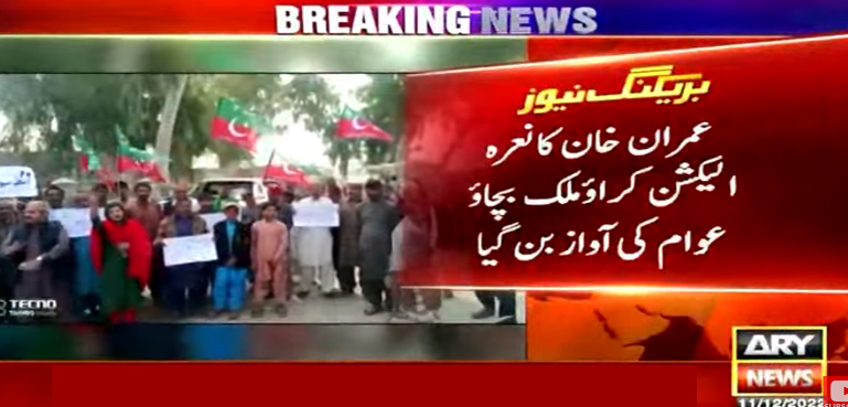 اے آر وائی نیوز کے مطابق عمران خان کا نعرہ الیکشن کراؤ اور ملک بچاؤ اب ایک مہم بن گیا ہے اور اس کا دائرہ پاکستان بھر میں پھیل گیا ہے۔