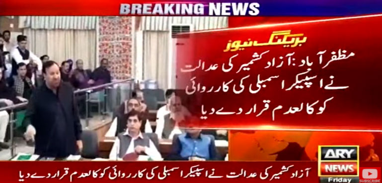 آزاد کشمیر ہائیکورٹ نے آزاد کشمیر قانون ساز اسمبلی کے آج ہونے والی اجلاس کے خلاف دائر درخواست پر اسپیکر اسمبلی کی کارروائی کو کالعدم قرار دیدیا۔