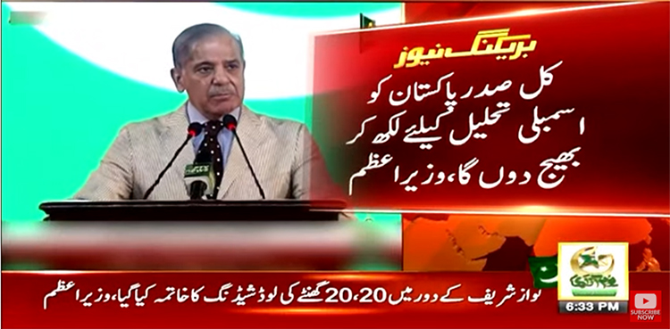 وزیراعظم شہبازشریف نے کہا ہے کہ کل ہم اپنی مدت پوری کر رہے ہیں کل صدر پاکستان کو اسمبلی تحلیل کیلئے لکھ کر بھیج دوں گا۔