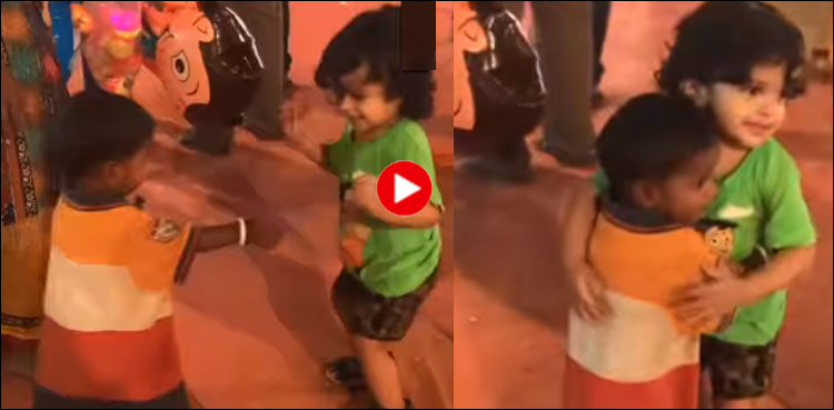 ویڈیو میں دیکھا جاسکتا ہے کہ ایک بچہ خوشی سے اچھل رہا ہے جبکہ اس کے سامنے کھلونے فروخت کرنے والی خاتون کا بچہ بھی کھڑا ہے جس کے پاؤں میں جوتے بھی نہیں ہیں، اچانک وہ کھیل میں مصروف بچے کی طرف ہاتھ بڑھاتا ہے اور پھر خود ہی اس کے قریب جاکر اسے گلے لگا لیتا ہے۔