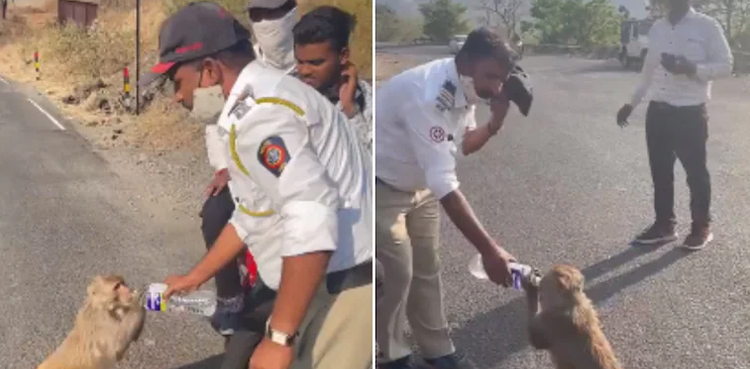 انٹرنیٹ پر وائرل ہونے والی ویڈیو میں دیکھا جاسکتا ہے کہ بندر کو پیاس کی شدت سے بے قرار ہوتے ٹریفک پولیس اہلکار سے دیکھا نہ گیا تو بوتل سے بندر کو پانی پلانے لگا۔