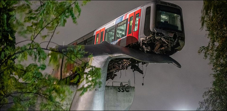 ٹرین پٹری سے اتری تو تیز رفتاری کے باعث جنگلا توڑ کر پل کے پار ہوگئی تاہم خوش قسمتی سے نیچے نہیں گری کیونکہ پل کے ساتھ وہیل مچھلی کی دم کے دیوہیکل مجسمے کے نے اسے گرنے سے بچالیا۔