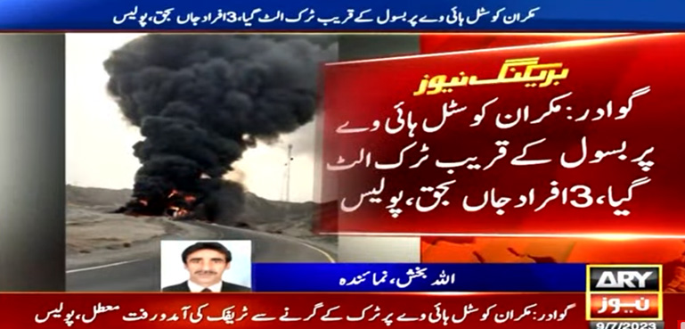اے آر وائی نیوز کے مطابق مکران کوسٹل ہائی وے پر بسول کے قریب ٹرک الٹنے کا واقعہ رونما ہوا ہے جس سے 3 افراد جاں بحق ہو گئے، حادثے کی وجہ سے ٹرک میں آگ بھڑک اٹھی۔