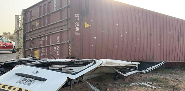 اماراتی میڈیا کے مطابق ام القوین کی مصروف شاہراہ پر خوفناک حادثہ پیش آیا، ٹرک پر رکھا کنٹینر تواز برقرار نہ رکھ سکا اور منی بس پر جا گرا۔
