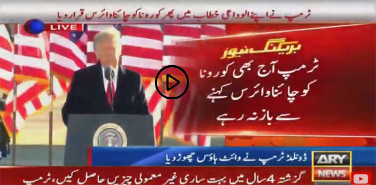 سبکدوش ہونے والے امریکی صدر ڈونلڈٹرمپ کورونا کو چائنا وائرس کہنے سے باز نہ آئے۔ ٹرمپ نے اپنے الوداعی خطاب میں پھر کورونا کو چائنا وائرس قرار دیا۔