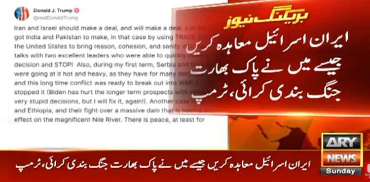 ٹرمپ نے کہا کہ ایران اسرائیل معاہدہ کریں جیسے میں نے پاک بھارت جنگ بندی کرائی، تجارت کا استعمال کرتے ہوئے پاک بھارت کے بہترین لیڈروں سے بات کی جس پر پاک بھارت بات چیت میں عقل سے فیصلہ کیا گیا اور دونوں رک گئے، عقل اور ہم آہنگی اور سمجھداری سے بات چیت کی جس سے کامیاب ہوئے۔