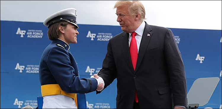 غیرملکی خبررساں ادارے کے مطابق امریکی صدر ڈونلڈ ٹرمپ نے کولوراڈو میں ایئرفورس اکیڈمی کی گریجویشن تقریب میں شرکت کی جہاں انہوں نے دو گھنٹے میں 990 کیڈٹس اور دیگر سینئر افسران سے ہاتھ ملایا۔