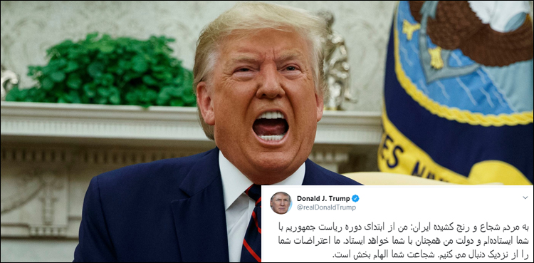 سماجی رابطے کی ویب سائٹ ٹویٹر پر ٹرمپ نے فارسی زبان میں ٹویٹ کرتے ہوئے ایرانی مظاہرین کی ہمت کو داد دی اور اُن کے عزم کو بھی سراہا۔ امریکی صدر کا کہنا تھا کہ بہادر،طویل عرصےسےمصائب کا شکار ایرانی قوم کےنام میرا پیغام ہے کہ ہم ایران میں مظاہروں کی قریب سے پیروی کررہے ہیں۔