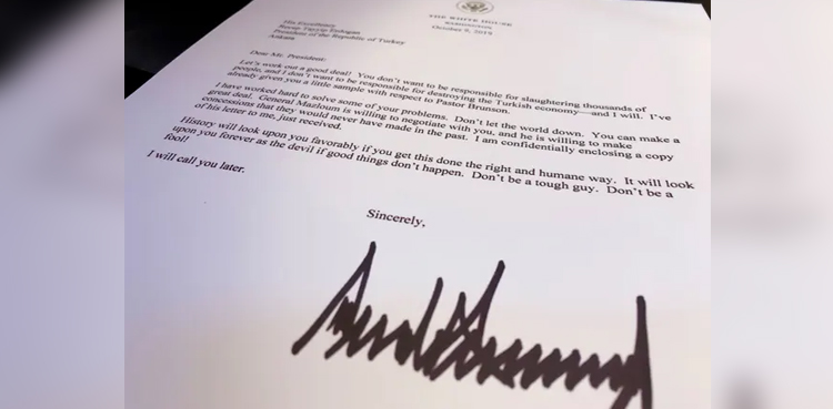 خط میں امریکی صدر کی جانب سے ترکی کو ڈیل کی بھی پیشکش کی گئی، ٹرمپ نے خبردار کیا کہ ترکی ہزاروں افراد کے قتل عام کا ذمے دار نہ بنے۔