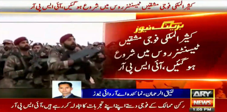 راولپنڈی : آئی ایس پی آر کا کہنا ہے کہ کثیرالملکی فوجی مشقیں ٹیسنٹنر روس میں شروع ہوگئیں ہیں ، پاکستان کافوجی دستہ بھی کثیرالملکی فوجی مشقوں میں شریک ہے، مشقیں ایک ہفتےتک جاری رہیں گی۔