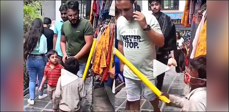 ویڈیو میں دیکھا جاسکتا ہے کہ بچہ ڈنڈا اٹھا کر شہریوں سے پوچھ رہا ہے کہ تم لوگوں کا ماسک کہاں ہے، بغیر ماسک کے گھوم رہے ہو ماسک پہنو۔