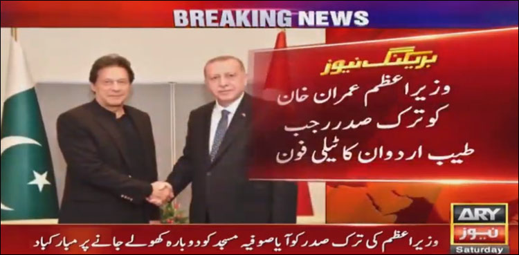 عمران خان نے ترک صدر کو آیا صوفیا مسجد کو دوبارہ کھولے جانے پر مبارک باد دیتے ہوئے کہا کہ لاکھوں پاکستانیوں نے مسجد کے مناظر ٹی وی پر دیکھے، وزیراعظم نے کرونا سے نمٹنے کے لیے اردوان کی کوششوں کی تعریف کی۔